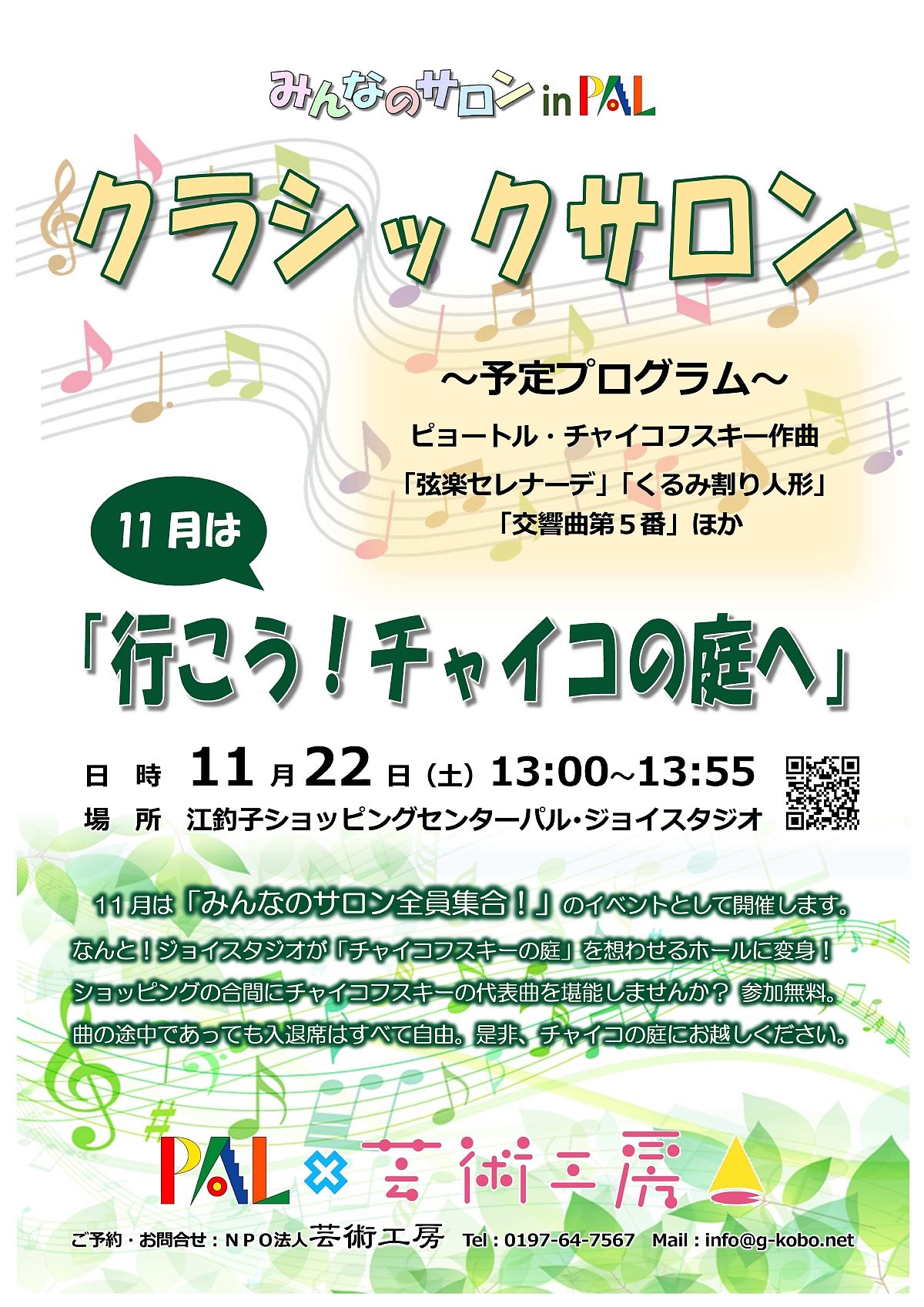 _11月のクラシックサロンは「みんなのサロン全員集合!」のイベントとしてジョイスタジオで開催します。なんと!ジョイスタジオが「チャイコフスキーの庭」を想わせるホールに変身!・・・まるで、パルの一角でクラシックコンサートが開催されているかのような雰囲気になります。