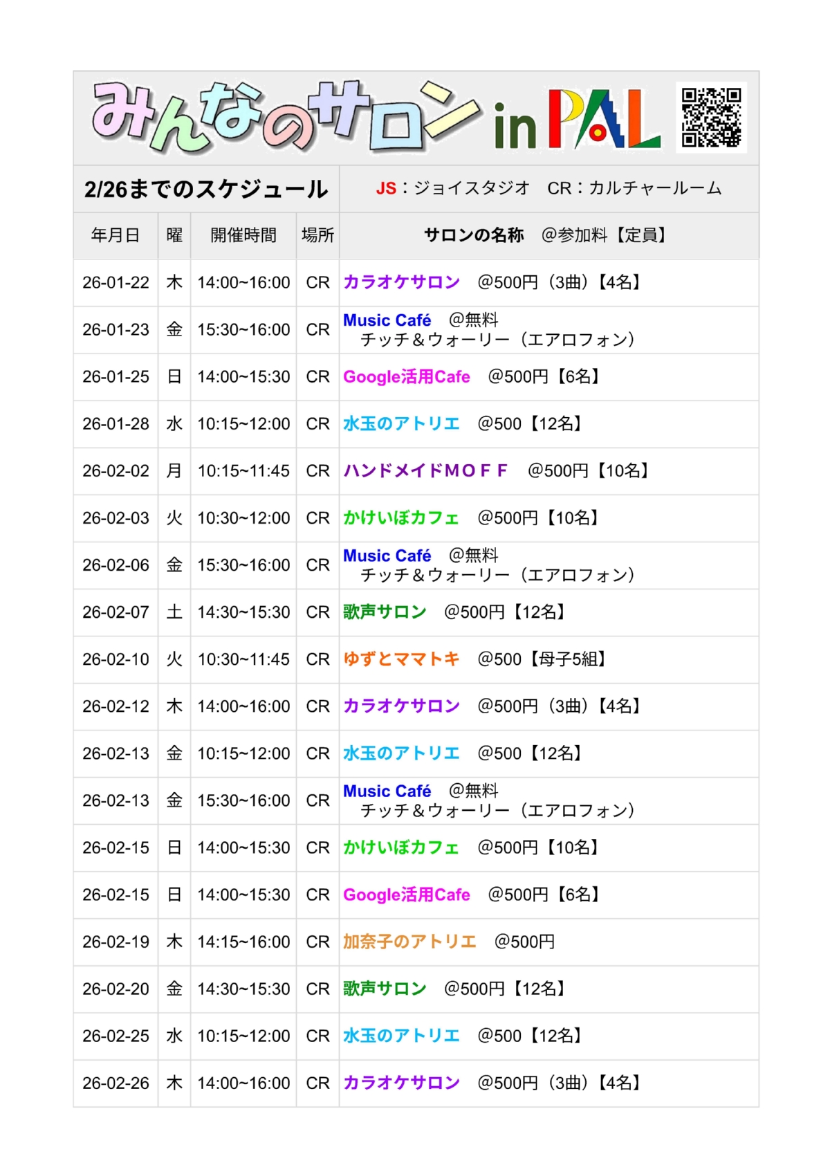 「みんなのサロン in PAL」開催スケジュール 2026年2月26日(木曜日) テーマ:みんなのサロン事業サロン・教室 スケジュールは予告なしに変更することがありますので、過去にこのページをご覧になった方は必ずページの再読み込みをお願いします。 «前へ TOP https://www.gkobo.jp/cat583/cat586/_in_pal_1.html「みんなのサロン in PAL」開催スケジュール メールアドレス 関連記事 「みんなのサロン in PAL」開催スケジュール 2026年2月26日(木曜日) 「歌声サロン」金曜開催 2026年2月20日(金曜日) 「加奈子のアトリエ」 2026年2月19日(木曜日) 「かけいぼカフェ」日曜開催 2026年2月15日(日曜日) 「水玉のアトリエ」金曜開催 2026年2月13日(金曜日)