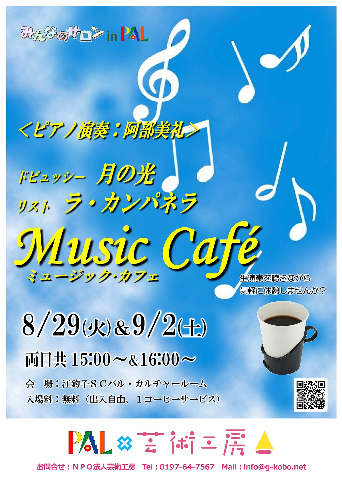 なお、芸術工房では「Music Café」の出演者を募集しています。出演してみたい方は、芸術工房までお問い合わせください。