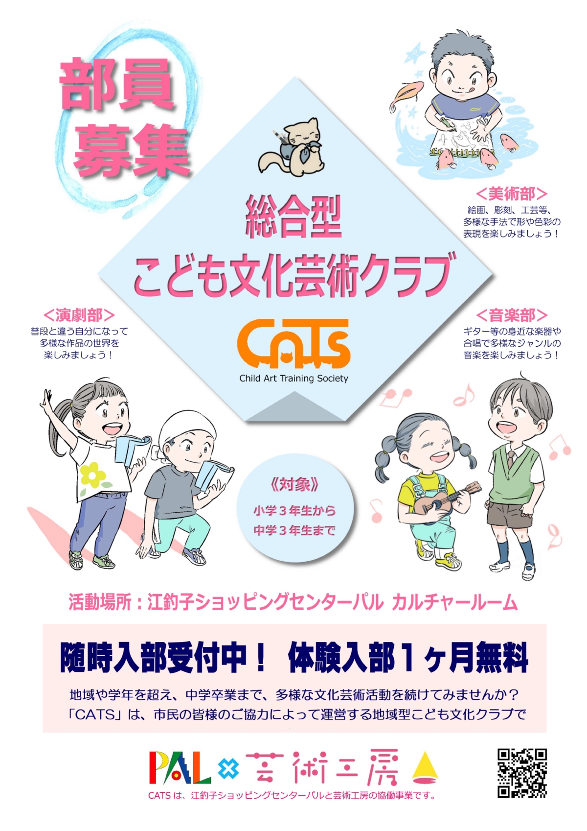 地域や学年を超え、中学の卒業まで、多様な文化芸術クラブで活動してみませんか?総合型こども文化芸術クラブ「CATS」では、令和8年度部員を募集しています。最大1ヶ月間は無料で体験入部できます。年度の途中からでも入部OK!今すぐ入部を申し込みましょう。