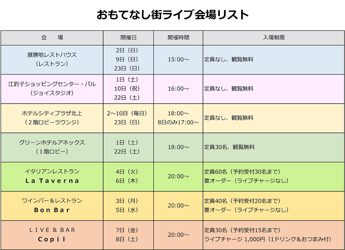 希望郷いわて国体・希望郷いわて大会の期間中、街の各所で大会盛り上げのライブ を開催し、全国の方々と楽しく交流するとともに、おもてなしの街〝北上″を全国に発信する。また、ホテルや飲食店がアーティストと連携することで、その後の商店街における「おもてなしライブ」の基盤をつくる。
