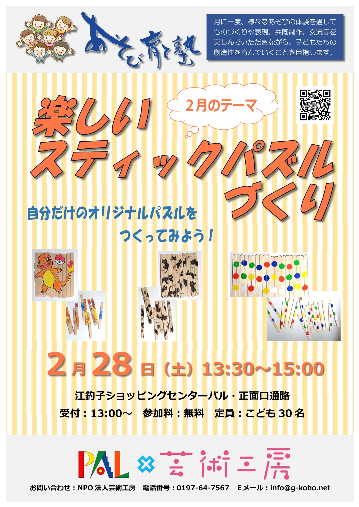 R8年2月開催|楽しいステッィクパズルづくり 2026年2月28日(土曜日) テーマ:あそび育て塾あそび育て塾事業 令和8年2月のあそび育て塾は「楽しいステッィクパズルづくり」です。 スティックを使って自分だけのオリジナルパズルをつくってみましょう! 材料は用意してありますので、親子でご参加ください。 楽しいスティックパズルづくり 日時:令和8年2月28日(土)13:30~15:00(13:00~参加受付) 場所:江釣子ショッピングセンターパル・ジョイスタジオ 参加料:無料 定員:こども30名 講師:熊谷祥子 «前へ 次へ» TOP https://www.gkobo.jp/cat583/cat613/r82.htmlR8年2月開催|楽しいステッィクパズルづくり メールアドレス 関連記事 R8年2月開催|楽しいステッィクパズルづくり 2026年2月28日(土曜日) R8年1月開催|書を楽しもう!私の夢はこれから・・・ 2026年1月17日(土曜日) R7年12月開催|クリスマスの生け花に挑戦 2025年12月20日(土曜日) R7年11月開催|何でもつくれる!紙あそび 2025年11月29日(土曜日) R7年10月開催|仮装して参加しよう!ハロウィンパーティー2025 2025年10月18日(土曜日)