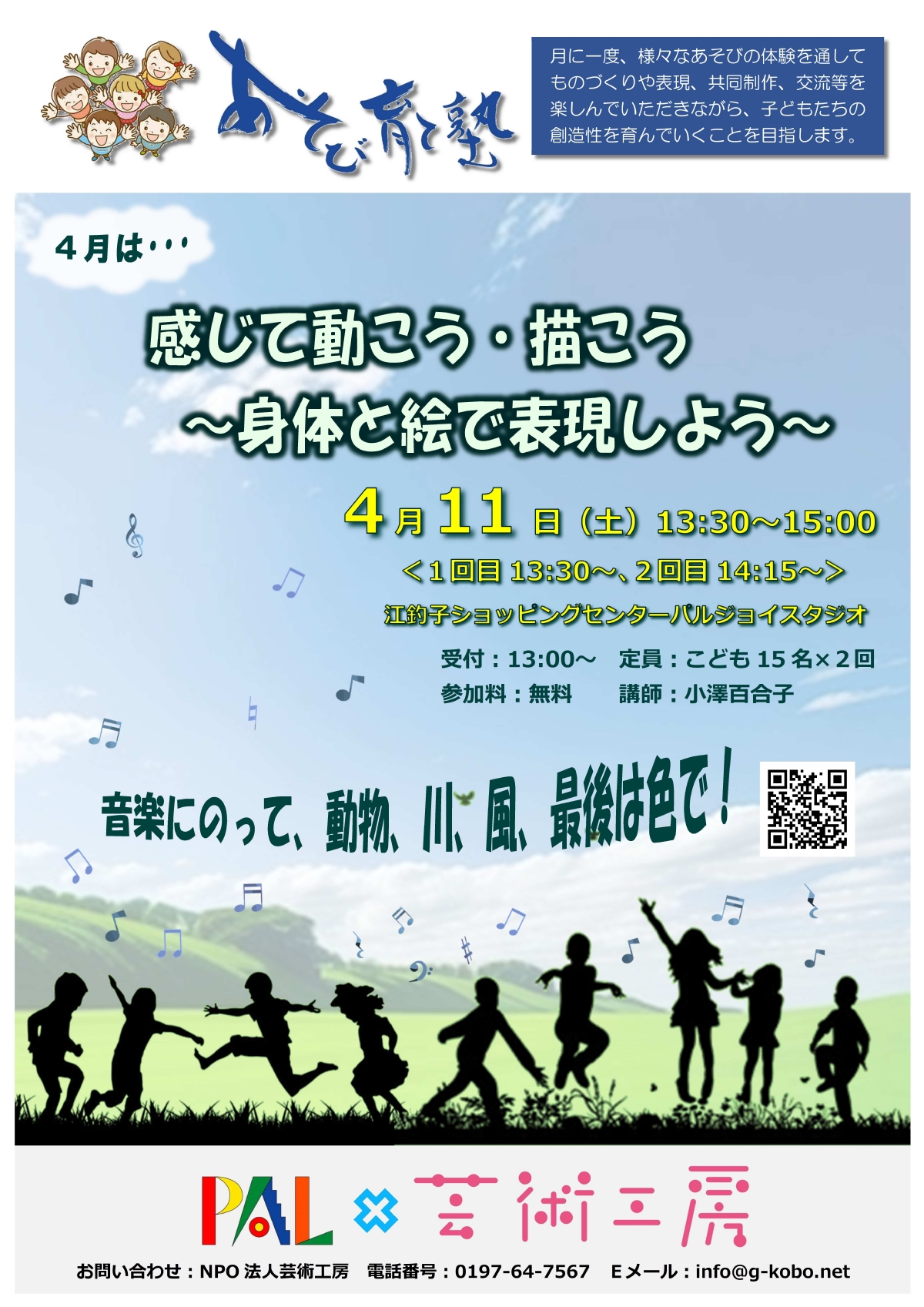 R8年4月開催|感じて動こう・描こう〜身体と絵で表現しよう〜 2026年4月11日(土曜日) テーマ:あそび育て塾あそび育て塾事業 令和8年4月のあそび育て塾は「感じて動こう・描こう〜身体と絵で表現しよう〜」です。 音楽にのって、動物、川、風などを体で表現し、最後は色で表現します!! 是非、3歳以上のお子様と一緒にご参加ください。 感じて動こう・描こう〜身体と絵で表現しよう〜 令和8年4月11日(土)13:30~15:00 (13:00~参加受付、1回目は13:30~、2回目は14:15~) 場所:江釣子ショッピングセンターパル・ジョイスタジオ 参加料:無料 定員:こども15名×2回 講師:小澤百合子 «前へ 次へ» TOP https://www.gkobo.jp/cat583/cat613/r84_2.htmlR8年4月開催|感じて動こう・描こう〜身体と絵で表現しよう〜 メールアドレス 関連記事 R8年4月開催|感じて動こう・描こう〜身体と絵で表現しよう〜 2026年4月11日(土曜日) R8年3月開催|新聞紙であそぶ玉入れ・的当てゲーム 2026年3月28日(土曜日) R8年2月開催|楽しいステッィクパズルづくり 2026年2月28日(土曜日) R8年1月開催|書を楽しもう!私の夢はこれから・・・ 2026年1月17日(土曜日) R7年12月開催|クリスマスの生け花に挑戦 2025年12月20日(土曜日)