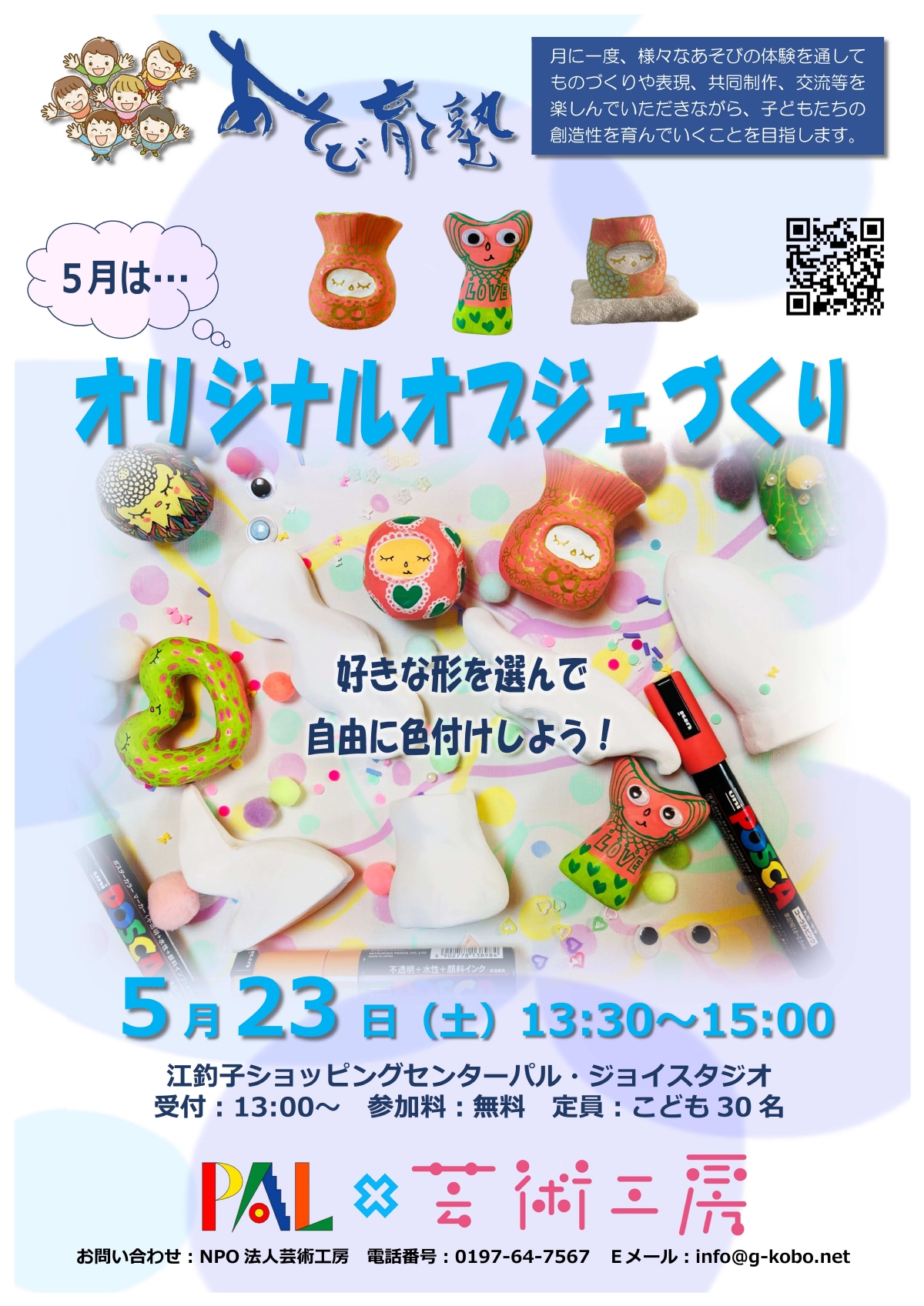R8年5月開催|オリジナルオブジェづくり 2026年5月23日(土曜日) テーマ:あそび育て塾あそび育て塾事業 令和8年5月のあそび育て塾は「オリジナルオブジェづくり」です。 色んな形の材料を用意しておくので、好きな形を選んで自由に色付けし、オリジナルオブジェをつくりましょう! 是非、3歳以上のお子様と一緒にご参加ください。 オリジナルオブジェづくり 好きな形を選んで自由に色付けしよう! 令和8年5月23日(土)13:30~15:00(受付は13:00~) 場所:江釣子ショッピングセンターパル・ジョイスタジオ 参加料:無料 定員:こども30名 講師:ひんとやひみ(佐藤美香) «前へ TOP https://www.gkobo.jp/cat583/cat613/r85.htmlR8年5月開催|オリジナルオブジェづくり メールアドレス 関連記事 R8年5月開催|オリジナルオブジェづくり 2026年5月23日(土曜日) R8年4月開催|感じて動こう・描こう〜身体と絵で表現しよう〜 2026年4月11日(土曜日) R8年3月開催|新聞紙であそぶ玉入れ・的当てゲーム 2026年3月28日(土曜日) R8年2月開催|楽しいステッィクパズルづくり 2026年2月28日(土曜日) R8年1月開催|書を楽しもう!私の夢はこれから・・・ 2026年1月17日(土曜日)